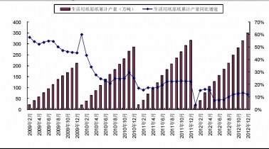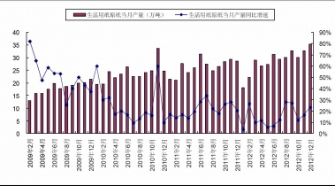 最新數據顯示,2012年12月生活用紙原紙的產量為35.3萬噸,全年累計產量達350.3萬噸,當月產量和累計產量的同比增速分別為23.41%和12.07%,當月產量增速環比繼續加快。生活用紙的消費屬性決定了其市場需求具有剛性,從各地市場情況來看,行業產銷情況基本平穩,盡管出貨量無法重演前兩年的爆發式增長(累計增長40%以上),但這恰好反映出行業演化的正確方向:過去低端雜牌和高端品牌生活用紙同享行業高增長的時期一去不復返,行業增速的蛋糕將主要由生活用紙行業的高端品牌瓜分。