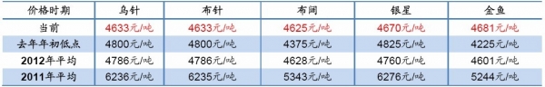 生活用紙龍頭企業一般會在木漿原料低價時期大量囤積原材料,毛利率的回升可在后續的一、兩個季度持續體現。目前烏針、布針和銀星的價格仍低于去年年初低點,布闊和金魚的價格雖有所回升但幅度有限;同時除金魚外,各類木漿價格均低于2012年全年的平均價格。因此,我們預計2013年上半年生活用紙的龍頭企業將繼續受惠于低價原料,有望保持較高的業績同比增速。