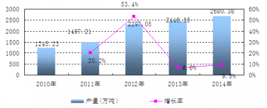自2010年以來,中國純堿產(chǎn)量產(chǎn)量整體保持穩(wěn)步增長的態(tài)勢,產(chǎn)量均高于2000萬噸。2010-2013年,我國純堿產(chǎn)量增長率一直保持下行的態(tài)勢,由2011年的13.5%逐步下降至2013年的1.1%。到了2014年純堿產(chǎn)量增長率出現(xiàn)反彈,由2013年的1.1%上升到3.5%,增長率上漲不快。2014年的產(chǎn)量突破2500萬噸,達(dá)到2514.68萬噸。