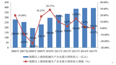 2015 年我國共有 263 家規模以上縫制機械生產企業,全年累計實現主營業務收入 393.5億元,較 2006 年增長 40.54%,年復合增長率為 3.85%。2006-2015 年,除 2007年受原材料和能源價格飛速上漲、國內服裝產業調整、人民幣升值、出口退稅稅率下調等影響以及 2008 年受國際金融危機影響之外,我國縫制機械行業規模以上企業總體保持增長趨勢。