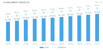 截至2017年6月,我國網(wǎng)民規(guī)模達到7.51億,半年共計新增網(wǎng)民1992萬人。互聯(lián)網(wǎng)普及率為54.3%,較2016年底提升1.1個百分點。