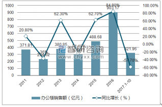 根據(jù)國(guó)家統(tǒng)計(jì)局?jǐn)?shù)據(jù)顯示:2016年上海辦公樓銷(xiāo)售額累計(jì)達(dá)903.17億元,同比增長(zhǎng)84.8%;2017年1-10月上海辦公樓銷(xiāo)售額累計(jì)達(dá)321.96億元;同比下降57.7%。
