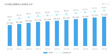 截至2017年6月,我國網民規模達到7.51億,半年共計新增網民1992萬人。互聯網普及率為54.3%,較2016年底提升1.1個百分點。