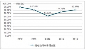 2012-2016年我國純電動汽車市場占比