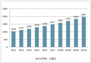 2012年至2016年,全球牛仔成衣市場的零售價值按復合年增長率8.2%增加,2016年總規模達4274億美元。全球大眾牛仔成衣市場的零售價值由2012年的1029億美元增加至2016年的1378億美元,復合年增長率為7.6%。全球中高端牛仔成衣市場的零售價值由2012年的1226億美元增加至2016年的1700億美元,復合年增長率為8.5%。全球奢侈品牛仔成衣市場的零售價值由2012年的863億美元增加至2016年的1196億美元,復合年增長率為8.5%。預計2019年全球大眾市場牛仔成衣零售額將達1585億美元,中高端牛仔成衣將達1980億美元,奢侈牛仔成衣則為1394億美元。