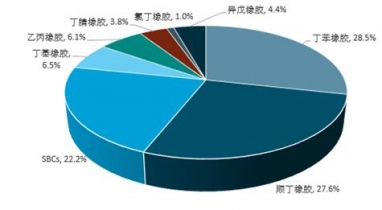 2017年新建裝置包括:煙臺浩普新材料6萬SBS裝置。改造裝置包括:華宇橡膠8萬噸/年順丁橡膠裝置改造成6萬噸/年SBS裝置。擴建裝置包括:雙惠橡膠SBS裝置、浙江信匯丁基橡膠裝置等。2017年,丁苯橡膠、順丁橡膠和SBCs年產(chǎn)能仍排在前3位,合計占當(dāng)年國內(nèi)合成橡膠總產(chǎn)能的78.3%,較上年下降約0.1個百分點。