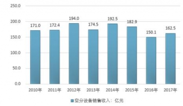 2017年我國空分設備行業市場規模約為162.5億元,同比2016年的150.1億元增加了8.26%,近幾年我國空分設備行業市場規模情況如下圖所示: