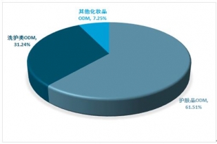 2017年我國化妝品ODM市場規(guī)模約93.8億元,其中護(hù)膚品ODM規(guī)模約57.7億元,占比約61.51%;洗護(hù)類ODM規(guī)模約29.3億元,占比約31.24%;其他化妝品ODM規(guī)模約6.8億元,占比約7.25%。