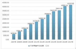 根據國家統(tǒng)計局數據,2017年我國汽車零售市場規(guī)模約42222億元,同比2016年的40692.16億元增長了3.76%,近幾年我國汽車零售市場規(guī)模情況如下圖所示: