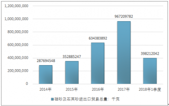 2016年我國硅砂及石英砂進出口貿易總量634383892千克,2017年進出口貿易總量967209782千克;2019年1季度進出口貿易總量398212042千克。