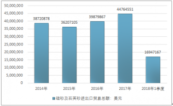 2016年我國硅砂及石英砂進出口貿易總額39879867美元,2017年進出口貿易總額44764551美元;2019年1季度進出口貿易總額16947167美元。