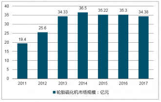 根據數據顯示,2017年我國輪胎硫化機市場規模為34.38億元,較2016年的35.3億元下降2.61%。