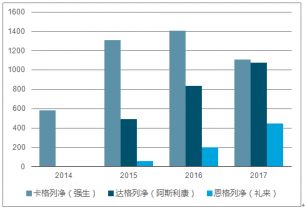 2014-2017年中國三大 SGLT-2 藥物的銷售額(百萬美元)