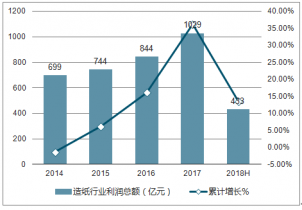 2017年全年造紙行業實現利潤總額達到1029億元,同比增長36.2%。到2018上半年全國造紙行業利潤總額達433億元,相比去年同期造紙13.5%。