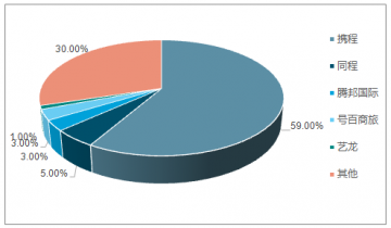 2017年中國在線機票市場中攜程份額最大,占比59%;同程占比5%,這一數字與攜程相比不到1/10;騰邦國際和號百商旅分別占比3%;藝龍占比1%。