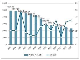 2017年前11月各州市旅游人數最多的是郴州市,累計游客4921.39萬人次,同比增長20.33%,累計旅游收入336.35億元,與去年同期相比增長21.47%。其次是湘潭接待國內外游客數4887.28萬人次,1-11月旅游收入共計321.19億元,同比增長21.83%。懷化旅游人數排名第三,共計4663.1萬人次,同比增長48.8%,旅游收入331.3億元,同比增長57.33%。