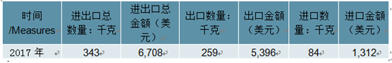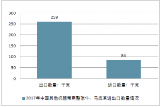 2017年中國其他機器帶用整張牛、馬皮革進出口總量343千克,進出口總金額6,708美元。
