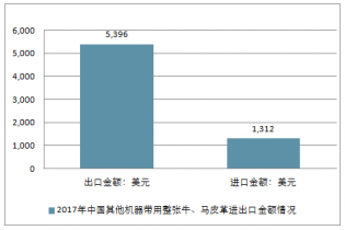 2017年中國其他機器帶用整張牛、馬皮革進出口金額情況