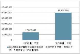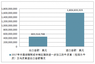 2017年中國經鞣制或半硝處理后進一步加工的牛皮革(包括水牛皮)及馬皮革進出口總量127,752,293千克,進出口總金額2,070,148,071美元。