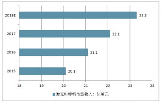 2016年全球激光打標機市場規模為22.1億美元,激光打標市場在未來幾年內將繼續持續增長,預計2018年全球激光打標設備收入會達到23.3億美元,同比增長5.43%。