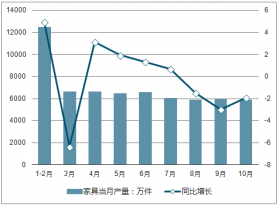 2018年1-10月全國家具當月產量及增長情況