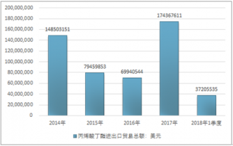 2016年我國丙烯酸丁酯進出口貿易總額69940544美元,2017年進出口貿易總額174367611美元;2019年1季度進出口貿易總額37205535美元。