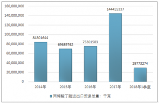2016年我國丙烯酸丁酯進出口貿易總量75301583千克,2017年進出口貿易總量144455337千克;2019年1季度進出口貿易總量29773274千克。