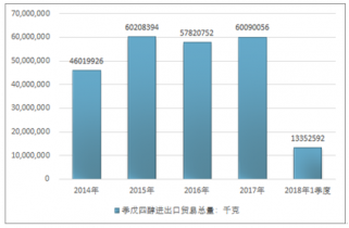2014-2018年1季度季戊四醇進出口貿易總量走勢圖(單位:千克)