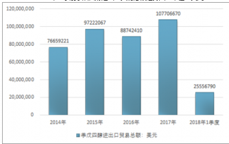 2014-2018年1季度季戊四醇進出口貿易總額走勢圖(單位:美元)