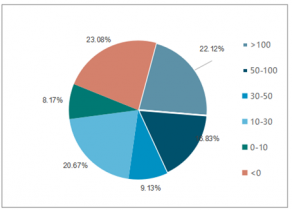 2018 年上半年,在電子行業(yè) 208 家公司中,歸母凈利潤(rùn)增速大于 100%的公司占比為 9.62%,增速在 50%~100%的公司占比為 9.62%,增速在 30%~50%的公司占比為 14.90%,增速在 10%~30%的公司占比為 20.67%,增速在 0~10%的公司占比為 8.17%,增速為負(fù)的公司占比為 37.02%。歸屬于母公司股東凈利潤(rùn)下降的公司顯著增多。