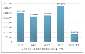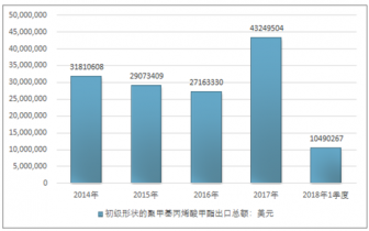 2016年我國初級形狀的聚甲基丙烯酸甲酯出口總額27163330美元,2017年出口總額43249504美元;2018年1季度出口總額10490267美元。