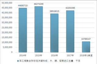2016年我國苯乙烯聚合物非泡沫塑料板、片、膜、箔等進出口貿易總量95556326千克,2017年進出口貿易總量107272611千克;2018年1季度進出口貿易總量27183983千克。