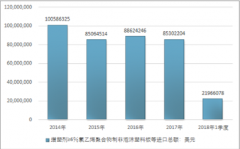 2016年我國增塑劑≥6%氯乙烯聚合物制非泡沫塑料板等進口總額88624246美元,2017年進口總額85302204美元;2018年1季度進口總額21966078美元。