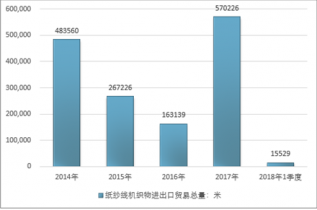 2016年我國紙紗線機織物進出口貿易總量163139米,2017年進出口貿易總量570226米;2018年1季度進出口貿易總量15529米。