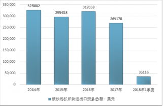 2016年我國紙紗線機織物進出口貿易總額319558美元,2017年進出口貿易總額269178美元;2018年1季度進出口貿易總額35116美元。
