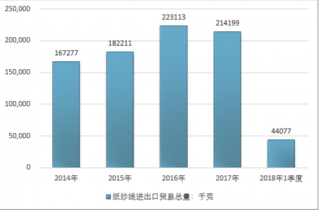 2016年我國紙紗線進出口貿易總量223113千克,2017年進出口貿易總量214199千克;2018年1季度進出口貿易總量44077千克。