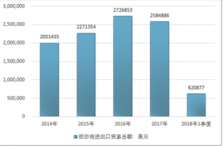 2016年我國紙紗線進出口貿易總額2726853美元,2017年進出口貿易總額2584886美元;2018年1季度進出口貿易總額620877美元。