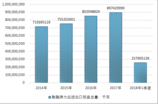2016年我國聚酯彈力絲進出口貿易總量853598829千克,2017年進出口貿易總量897420990千克;2018年1季度進出口貿易總量257905139千克。