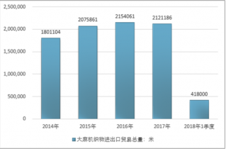 2016年我國大麻機織物進出口貿易總量2154061米,2017年進出口貿易總量2121186米;2018年1季度進出口貿易總量418000米。