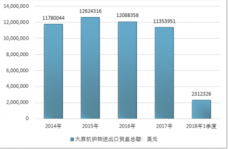 2016年我國大麻機織物進出口貿易總額12088358美元,2017年進出口貿易總額11353951美元;2018年1季度進出口貿易總額2312326美元。