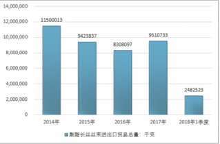 2016年我國聚酯長絲絲束進出口貿易總量8308097千克,2017年進出口貿易總量9510733千克;2018年1季度進出口貿易總量2482523千克。