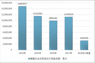 2016年我國聚酯長絲絲束進出口貿易總額9904182美元,2017年進出口貿易總額11256523美元;2018年1季度進出口貿易總額3194193美元。