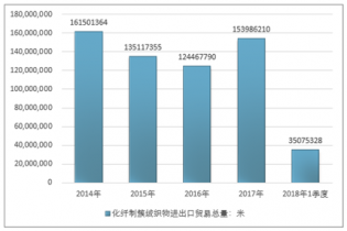 2016年我國化纖制簇絨織物進出口貿易總量124467790米,2017年進出口貿易總量153986210米;2018年1季度進出口貿易總量35075328米。