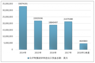 2016年我國化纖制簇絨織物進出口貿易總額18840497美元,2017年進出口貿易總額21375380美元;2018年1季度進出口貿易總額4643863美元。