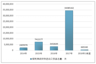 2016年我國棉制繩絨織物進出口貿易總量3450649米,2017年進出口貿易總量34385162米;2018年1季度進出口貿易總量665340米。