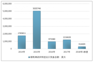 2016年我國棉制繩絨織物進出口貿易總額973380美元,2017年進出口貿易總額1216620美元;2018年1季度進出口貿易總額314403美元。