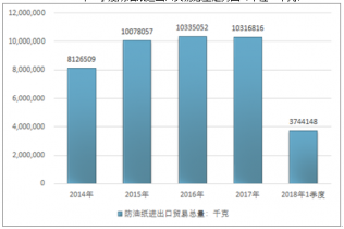 2016年我國防油紙進出口貿易總量10335052千克,2017年進出口貿易總量10316816千克;2018年1季度進出口貿易總量3744148千克。