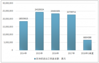2016年我國防油紙進出口貿易總額23401505美元,2017年進出口貿易總額22739711美元;2018年1季度進出口貿易總額6604388美元。