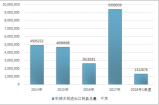 2016年我國機械木漿進出口貿易總量2618281千克,2017年進出口貿易總量9399039千克;2018年1季度進出口貿易總量1322676千克。