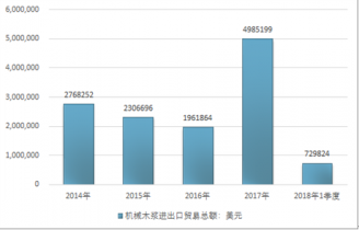 2016年我國機械木漿進出口貿易總額1961864美元,2017年進出口貿易總額4985199美元;2018年1季度進出口貿易總額729824美元。